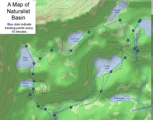 A view of Naturalist Basin. On our trip, we did the route in a clockwise fashion, and the blue dots were our tracking points recorded every 10 minutes using a Dolorme inReach. SE. Our route starts at the bottom of this image. |